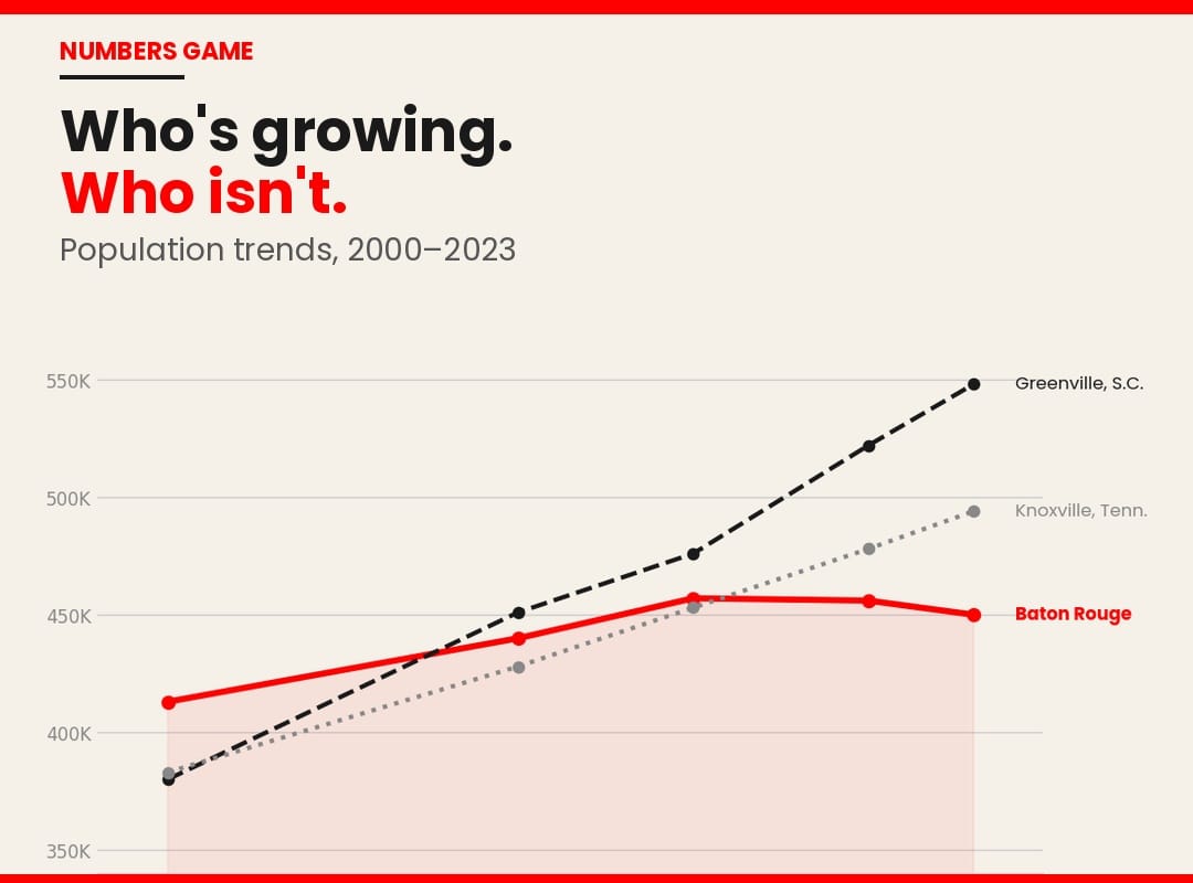 The hard numbers: The plan documents a city in measurable decline. Baton Rouge's population has plateaued and begun to fall while peer cities like Greenville, S.C., and Knoxville, Tenn., continue to grow. Housing affordability has dropped every year since 2014. A possible budget deficit—exacerbated by the St. George incorporation, according to the document—looms by fiscal year 2027.
