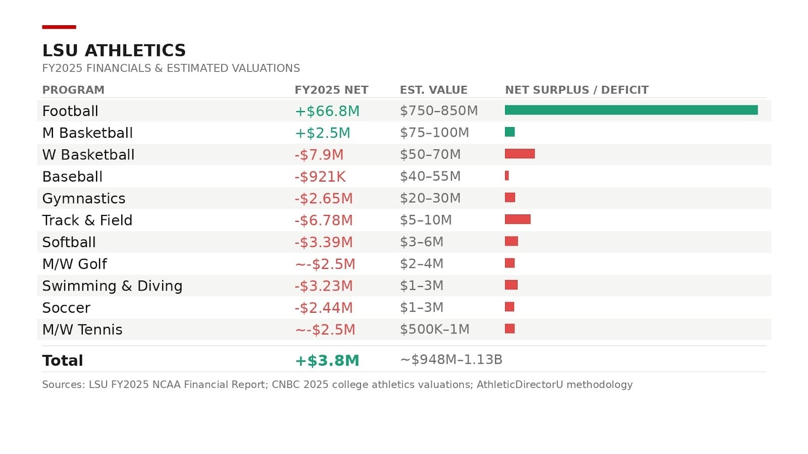 Editor's note: Program valuations are estimates based on a standard revenue multiple methodology used by CNBC, Sportico and AthleticDirectorU to value college athletic programs. Individual sport valuations apply a 4–7x revenue multiple adjusted for conference affiliation, brand strength, NIL ecosystem, media rights access and profit/loss trajectory. Financial data sourced from LSU's FY2025 NCAA financial report. Valuations reflect open-market estimates only and do not represent actual transaction values.